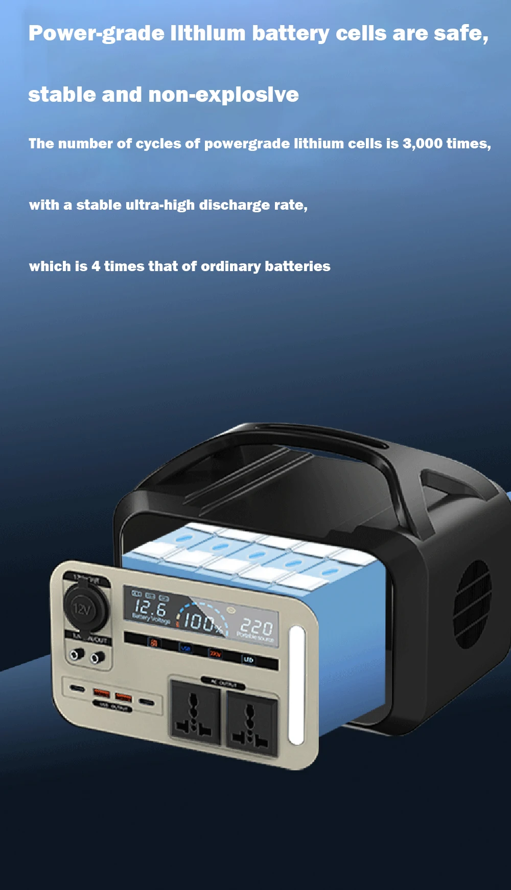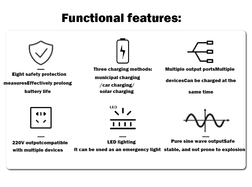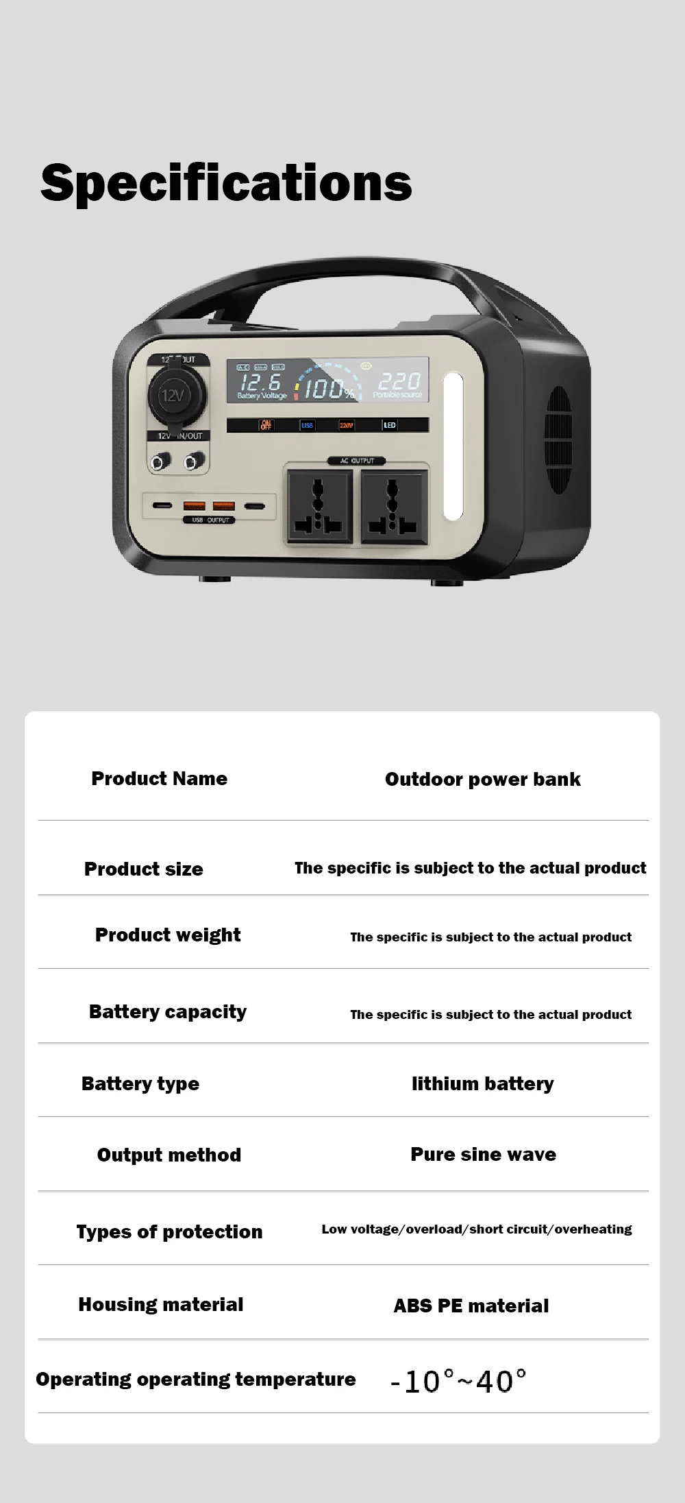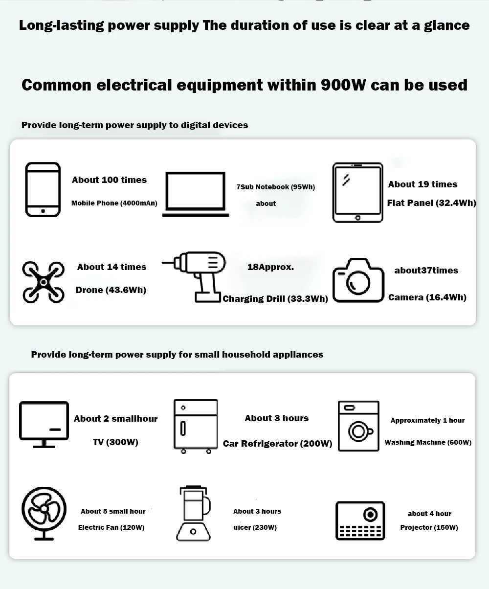 Long-lasting power supply The usage time can be used for common electrical equipment within 900W
